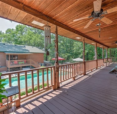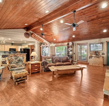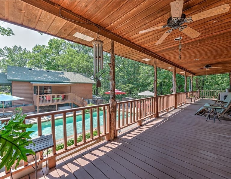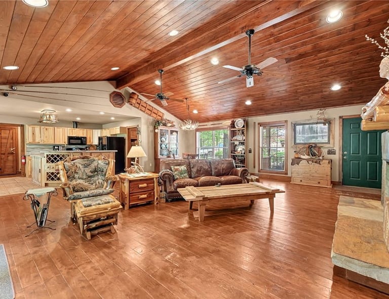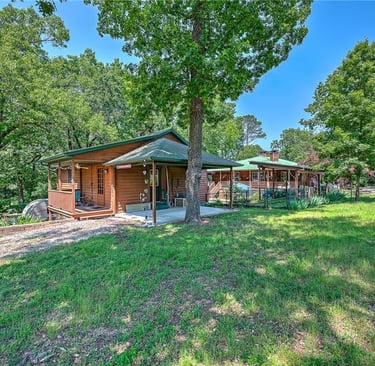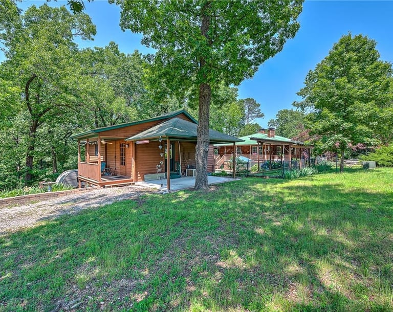 Escape to the rustic charm of this 2.78-acre lodge-style retreat near Beaver Lakes Rocky Branch, featuring a 3, 052 sq ft main homeincluding a downstairs puband a 790 sq ft guest house with a heated/cooled 790 sq ft shop. The main home showcases custom doors, built-ins, real antler chandeliers, and wood-burning fireplaces. Downstairs offers a cozy pub, full bath, and workshopideal for entertaining or hobbies. A spacious 4-car garage with an extra roll-up door provides ample storage, and a whole-home Generac generator ensures year-round peace of mind. The guest house/in-law suite includes pine floors, a full kitchen, and private patio for extended stays. The attached heated/cooled shop has a half bath and potential for additional living space. Outdoor amenities include a solar-heated sport pool, hot tub, plumbed outhouse, turfed bocce ball court, RV parking, and lush landscaping filled with perennials and native plants. This one-of-a-kind property blends comfort, craftsmanship, and outdoor luxury.